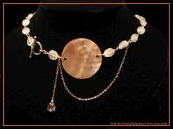 A dramatic statement of multi colored aquamarine with a single, dramatic mother of pearl centerpiece. An asymmetrical chain swag and off center clasp give the piece an off-beat charm. $65